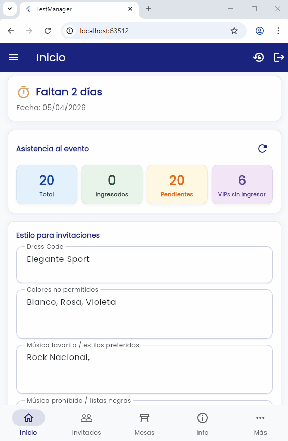 Brindáles a tus anfitriones una plataforma profesional para gestionar su lista de invitados sin errores. Olvidáte de recibir excels desordenados o papeles de último momento; con FestManager, tu cliente centraliza menús, perfiles VIP y asistencias en un solo lugar, garantizando que vos y tu equipo tengan la información exacta para el día del evento.
